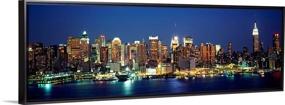 <p>A panoramic photograph of the Manhattan shore and skyscrapers illuminated at night.</p>