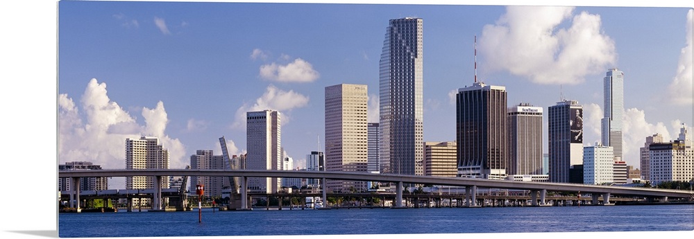 <p>This urban landscape wall art is the city skyline taken from the water with a roadway passing in front of the skyscrapers.</p>