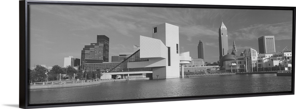 <p>A black and white panoramic photograph taken of buildings in Cleveland sitting on water with the rock and roll hall of fame front and center.</p>