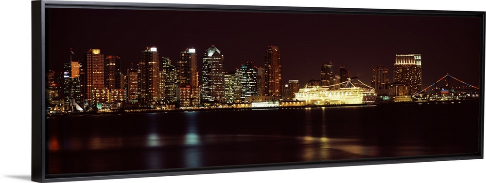 <p>Panoramic photograph on a big wall hanging of the San Diego skyline along the edge of the water, lit up at night.</p>
