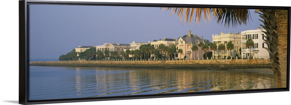 <p>A panoramic picture taken of houses on the waterfront in Charleston. Palm trees line the right side of the picture with some of their leaves shown on top.</p>