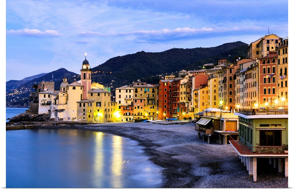 <p>Buildings illuminated by lights along the water's edge at sunrise, Camogli, Liguria, Italy.</p>