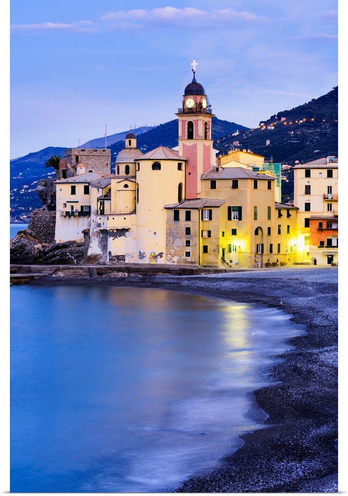 <p>Buildings illuminated by lights along the water's edge at sunrise, Camogli, Liguria, Italy.</p>