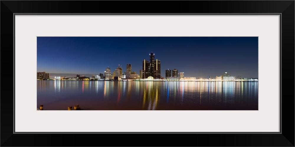<p>Panoramic photograph of skyline and waterfront at night. The building lights create colorful reflections in the water.</p>