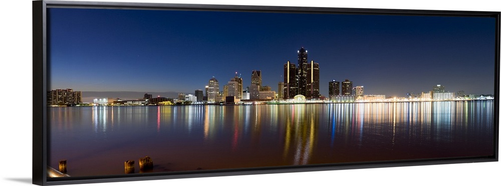 <p>Panoramic photograph of skyline and waterfront at night. The building lights create colorful reflections in the water.</p>