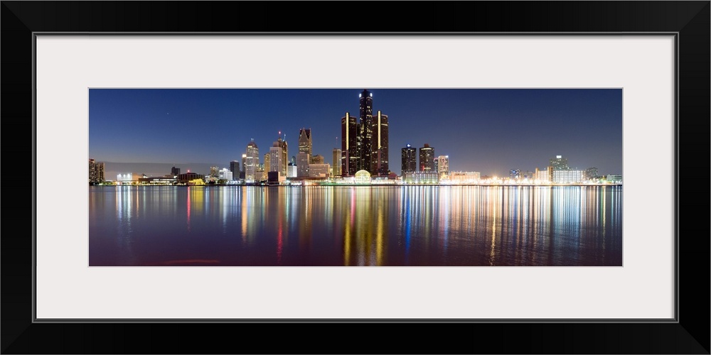 <p>Wide angle photograph of the distant Detroit skyline, lit at night and reflecting in the waters of the Detroit River.</p>