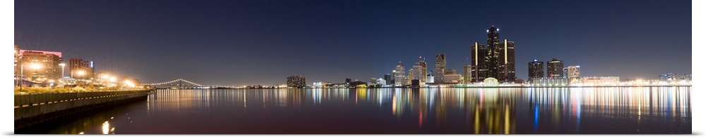 <p>Panoramic image of the Detroit skyline in the evening with the buildings and lights mirrored in the water.</p>
