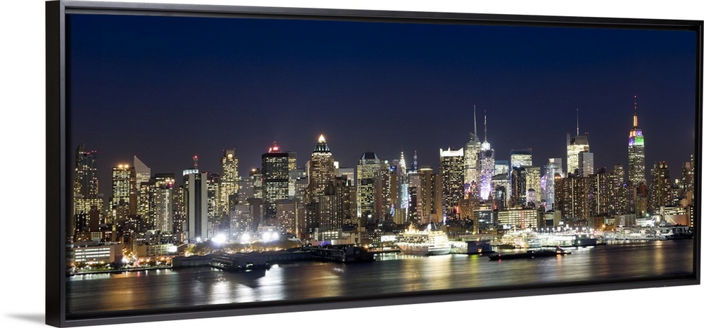 <p>Panoramic photograph showcases a busy skyline filled with skyscrapers as they shine brightly in the night sky. The intense glow of the buildings can be seen blurred over the river in the foreground.</p>