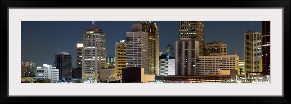 <p>Oversize horizontal photograph of lit skyscrapers against a deep blue sky at night, in Detroit, Michigan.</p>