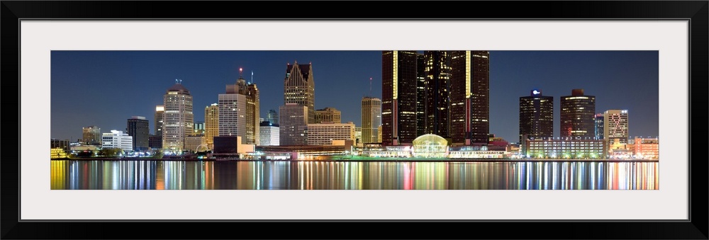 <p>Panoramic photograph of skyline after sunset with city lights reflected in waterfront.</p>