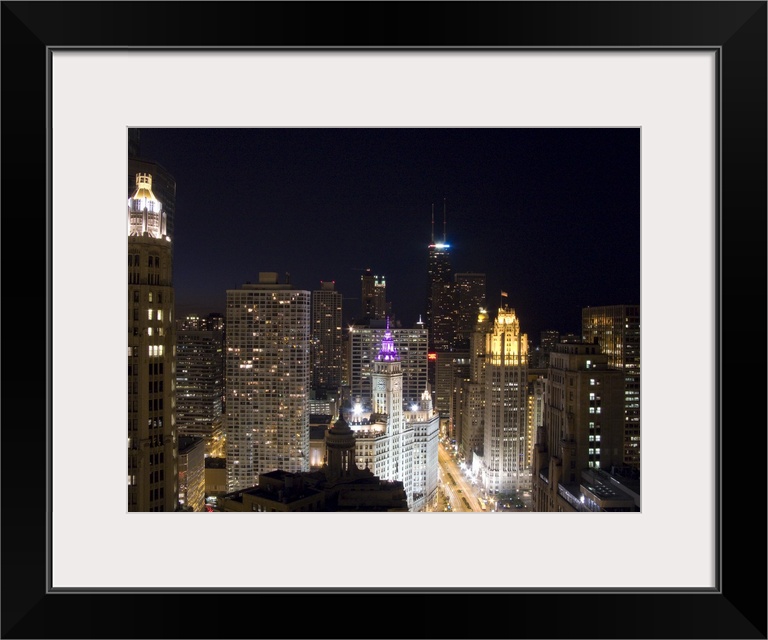 <p>Large photograph of downtown Chicago, Illinois (IL) lit up at night featuring the Magnificent Mile, Upper Michigan Avenue, and the Willis Tower.</p>