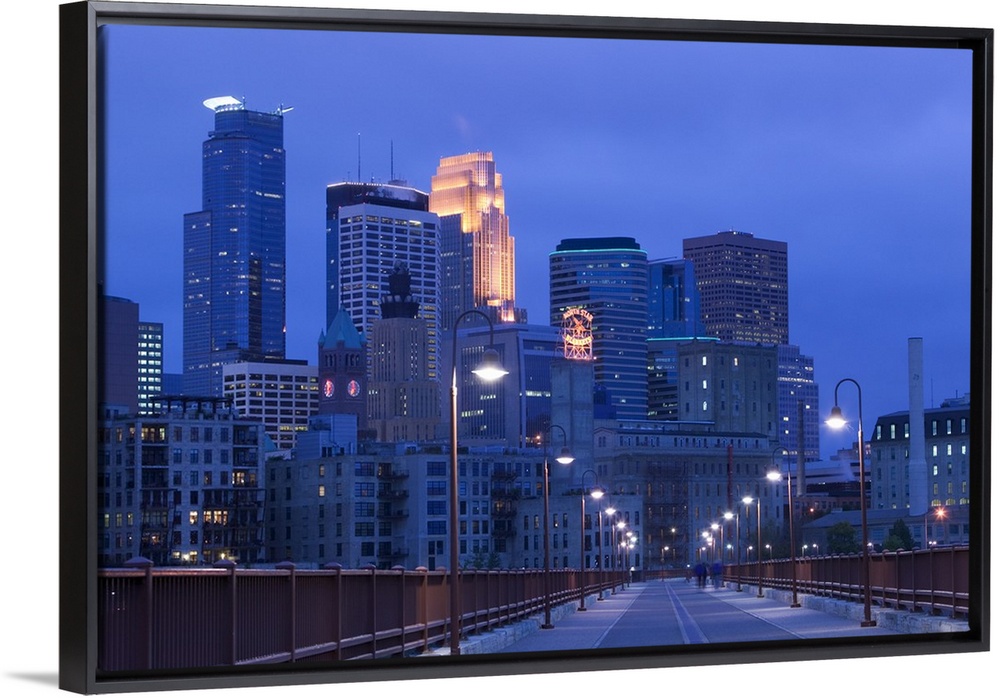 <p>Giant photograph taken of skyscrapers filling the Minneapolis skyline at night. The light posts in the foreground can be seen following the entire walkway.</p>