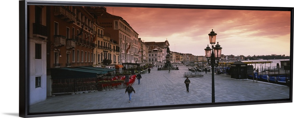 <p>Panoramic photo of people walking on the promenade along the waterfront at sunrise in Venice, Italy.</p>