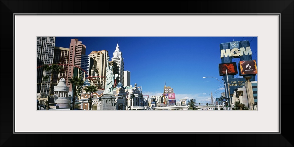 <p>The casinos of the Sin City in the bright sunlight have been photographed from ground level at midday in this panoramic decorative wall hanging for the home or office.</p>