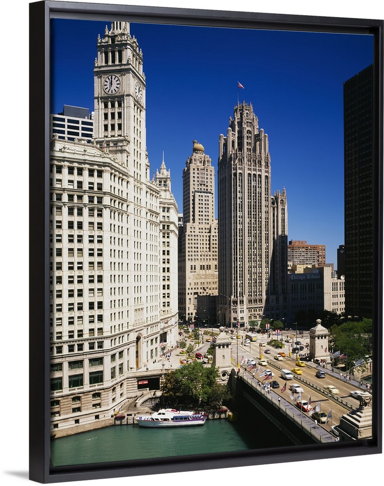 <p>Tall skyscraper buildings in downtown Chicago along the river as cars hustle about the busy streets.</p>