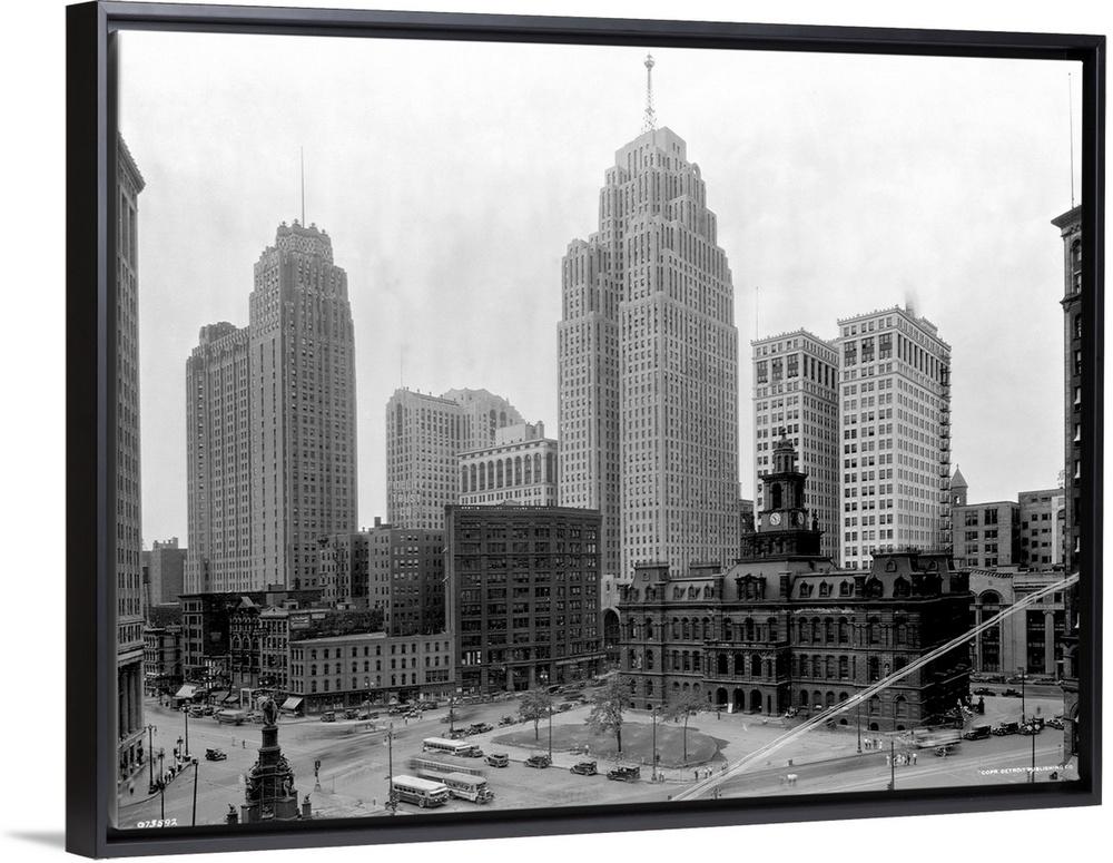 <p>The Guardian Building (tall tower on l) and the Penobscot Building (tall tower on r) tower over a public square in the heart of Detroit, Michigan.</p>
