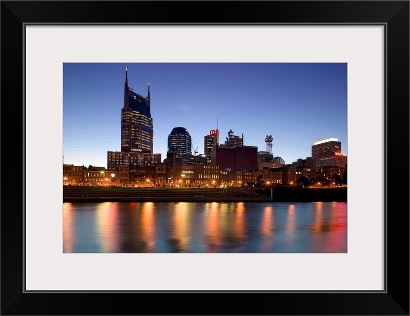 <p>This photograph city skyline lit up in the early twilight and the city lights reflect in the water.</p>