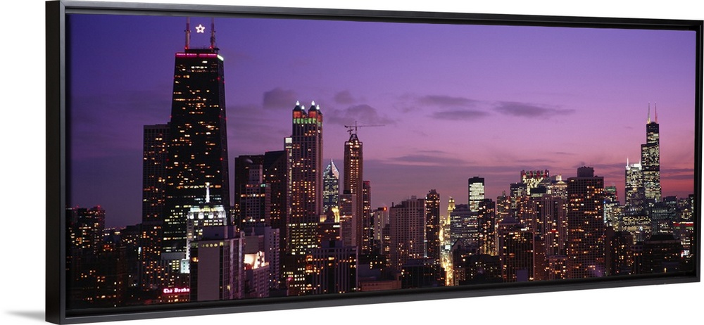 <p>Dusk panoramic shot of the tops of lit up buildings in downtown Chicago.</p>