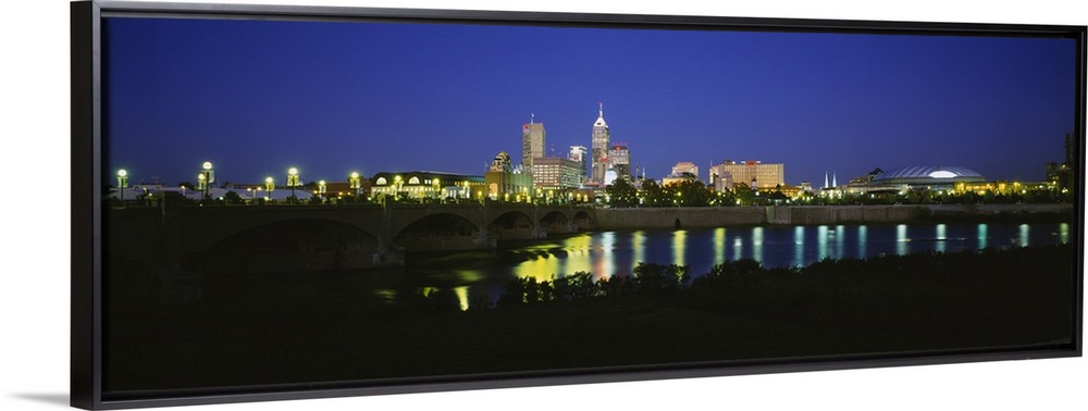 <p>Big panoramic photo on canvas of a lit up city skyline past a bridge over a river.</p>