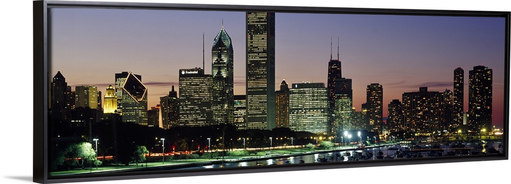 <p>A wide angle picture taken of the Chicago skyline during sun down with the buildings illuminated.</p>