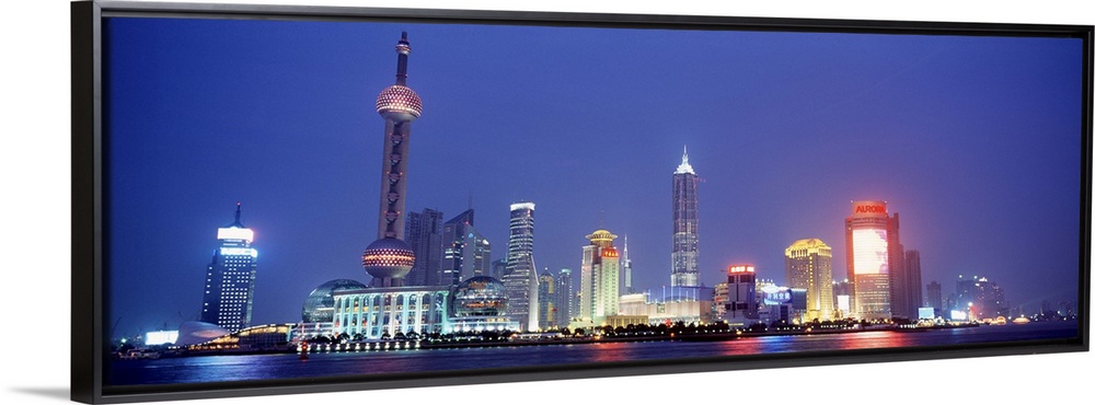 <p>Panoramic photograph of skyline and water front at night.</p>