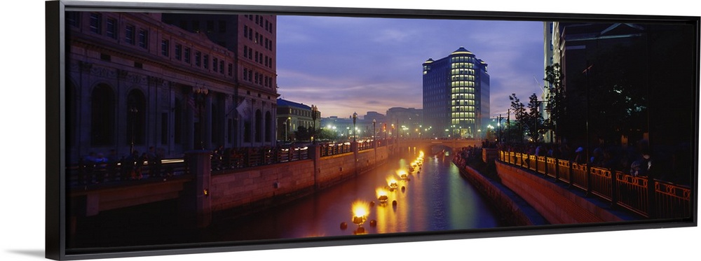 <p>Braziers of fire on the water of the Providence River at twilight in Providence, Rhode Island.</p>