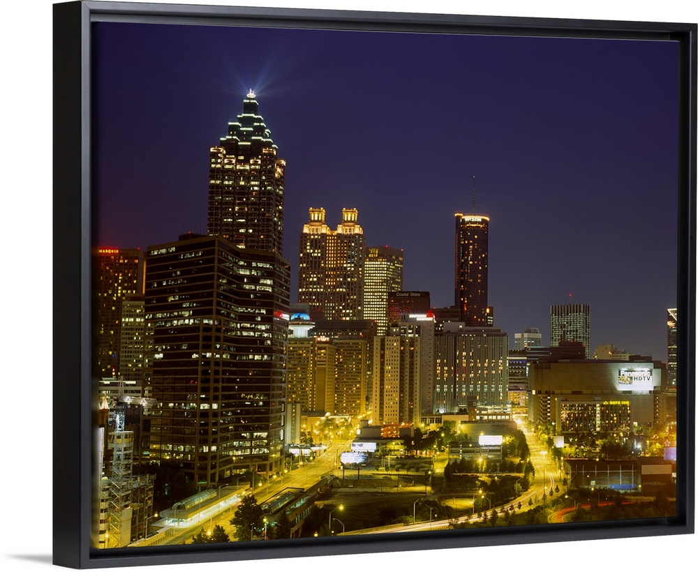 <p>Large photograph displays a busy capital city in the Southeastern United States as the lights of tall buildings and skyscrapers illuminate the nighttime sky. Photographer uses a slow shutter speed to get the effect of fast moving lights on the cars.</p>