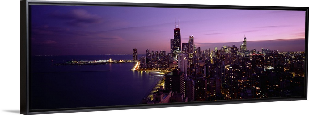 <p>Narrow and horizontal canvas of downtown Chicago lit up at night with the waterfront on the left.</p>