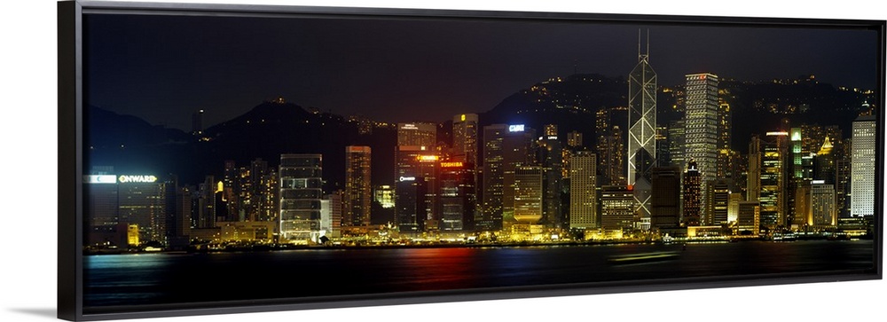 <p>Panoramic photograph of the Hong Kong skyline, lit up at night, reflecting in the water, in China.</p>