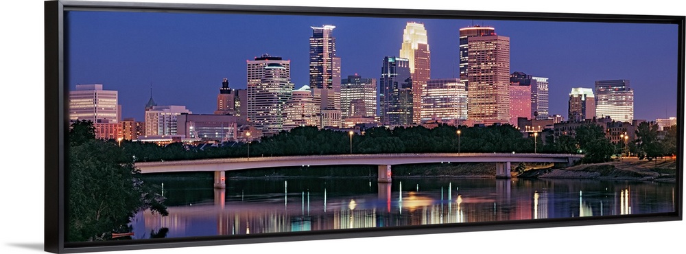 <p>Panoramic photograph includes a nighttime skyline for the largest city in Minnesota. The gently rippling waterway in the foreground reflects the image of the bridge and skyscrapers in the distance.</p>