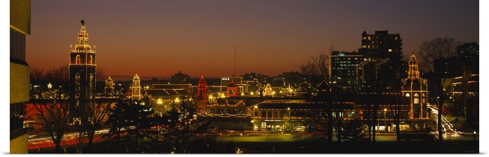 <p>A panoramic picture of a city skyline with lights outlining the buildings and bare trees in the foreground.</p>