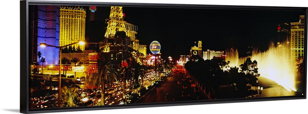 <p>Panoramic photograph displays the brightly lit strip of Las Vegas, Nevada filled with hotels, casinos and a fountain in the foreground.</p>