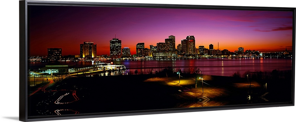 <p>Panoramic photograph of city skyline at sunset. The lights from the buildings and street lamps are shining in the dark night sky and are reflected in the water.</p>
