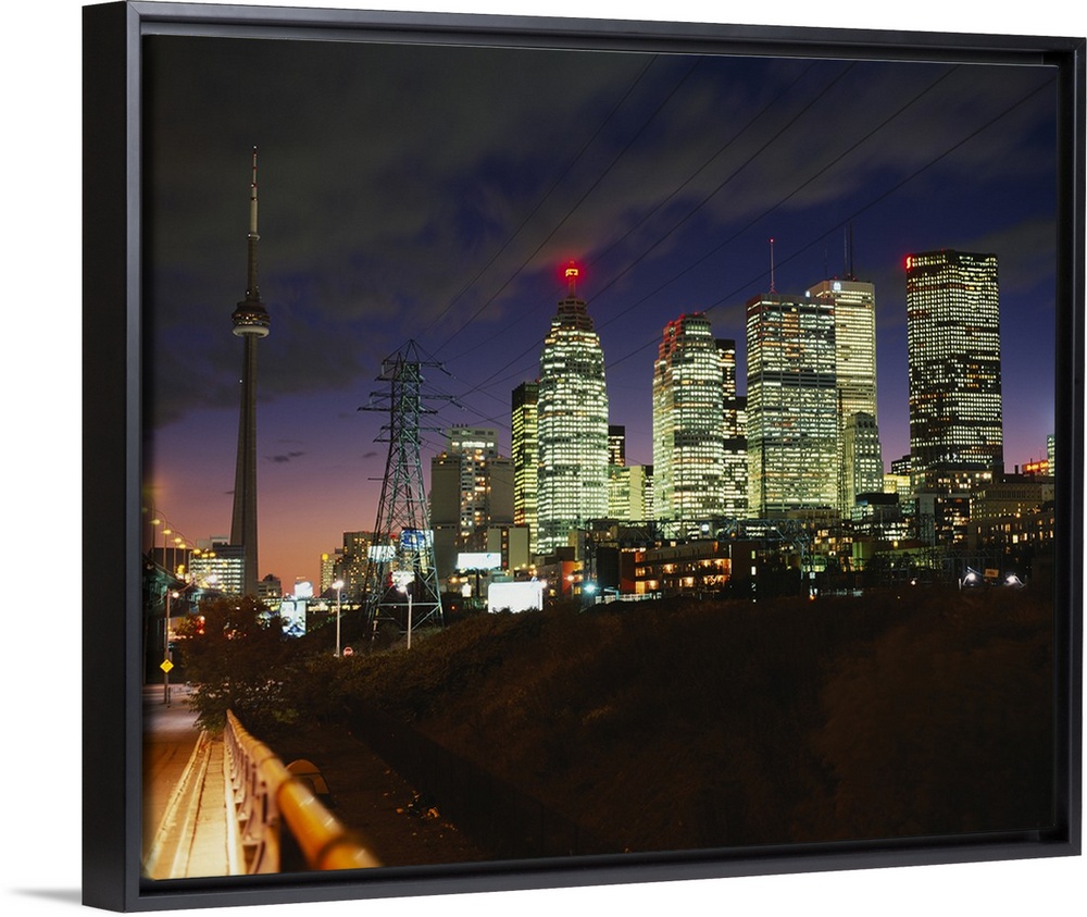 <p>Landscape photograph taken from a street of brightly lit skyscrapers beneath a cloudy sky at night, in Toronto, Ontario, Canada.</p>