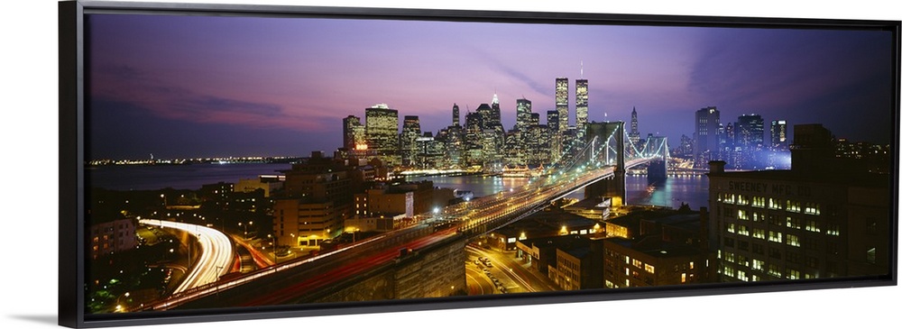 <p>Panoramic image of lower Manhattan lit up at night with the World Trade Center buildings and the Hudson River bridge and New Jersey in the foreground.</p>