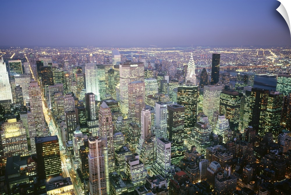 <p>A photograph taken from the top of a building of the endless city scape illuminated at night.</p>