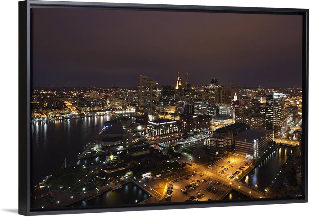 <p>An aerial photograph taken of Baltimore during the night. Buildings are illuminated along with the edge of the harbor.</p>