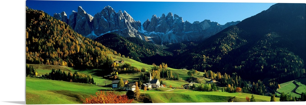 <p>Panoramic photograph shows an aerial view overlooking an open mountainous region of Europe that is filled with scattered patches of trees surrounding a few structures in the middle of the picture. The backdrop consists of more bare, jagged rock faces that are sprinkled with snow.</p>
