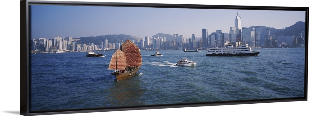 <p>Panoramic print of ships sailing in the ocean with a downtown cityscape in the distance meeting the water.</p>