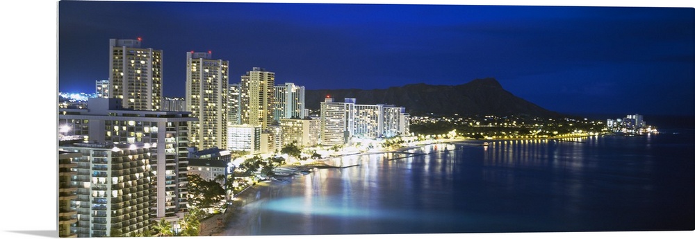 <p>Panoramic photograph shows an illuminated skyline shining brightly on the coast of an island within the Pacific Ocean while a small mountain sits in the backdrop. The bright lights of the skyscrapers and surrounding structures reflect over the water below.</p>