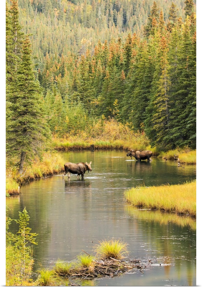 <p>Bull and cow moose (alces alces) feeding in a shallow pond south of Cantwell, photo taken from Parks Highway common moose habitat, Alaska, United States of America.</p>