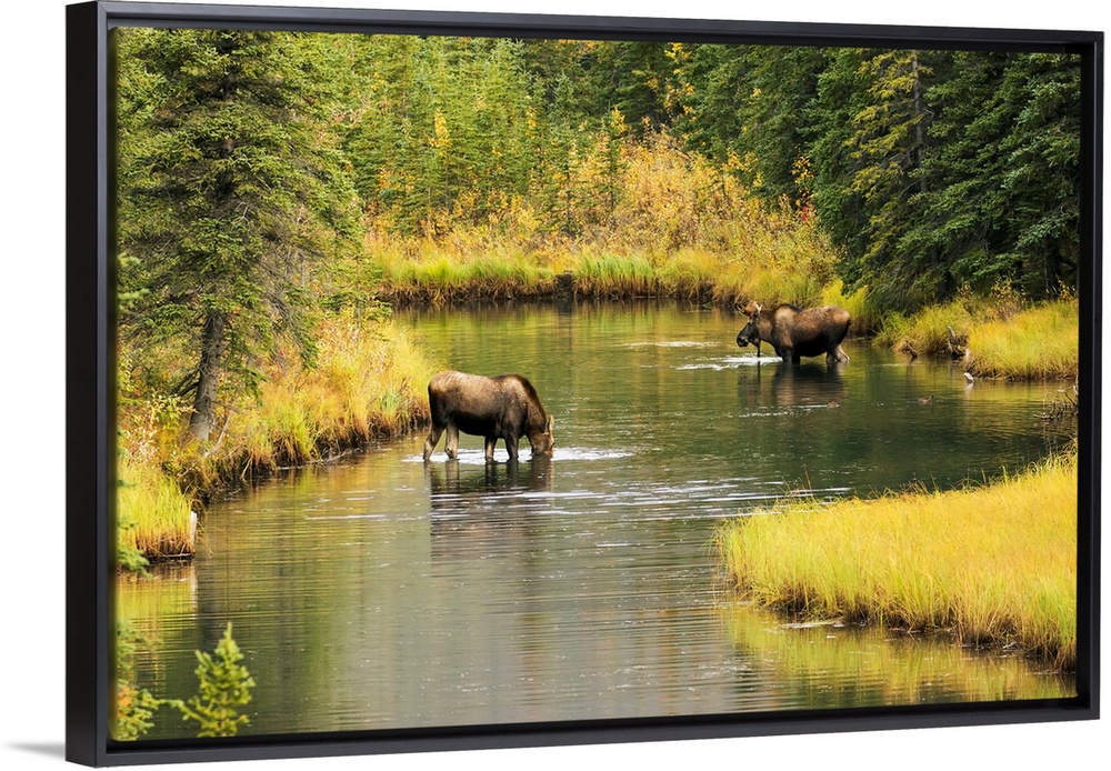 <p>Bull and cow moose (alces alces) feeding in a shallow pond south of Cantwell, photo taken from Parks Highway common moose habitat, Alaska, United States of America.</p>