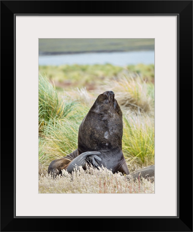 <p>Bull and female Patagonian sea lion in tussock belt, Falkland Islands.</p>