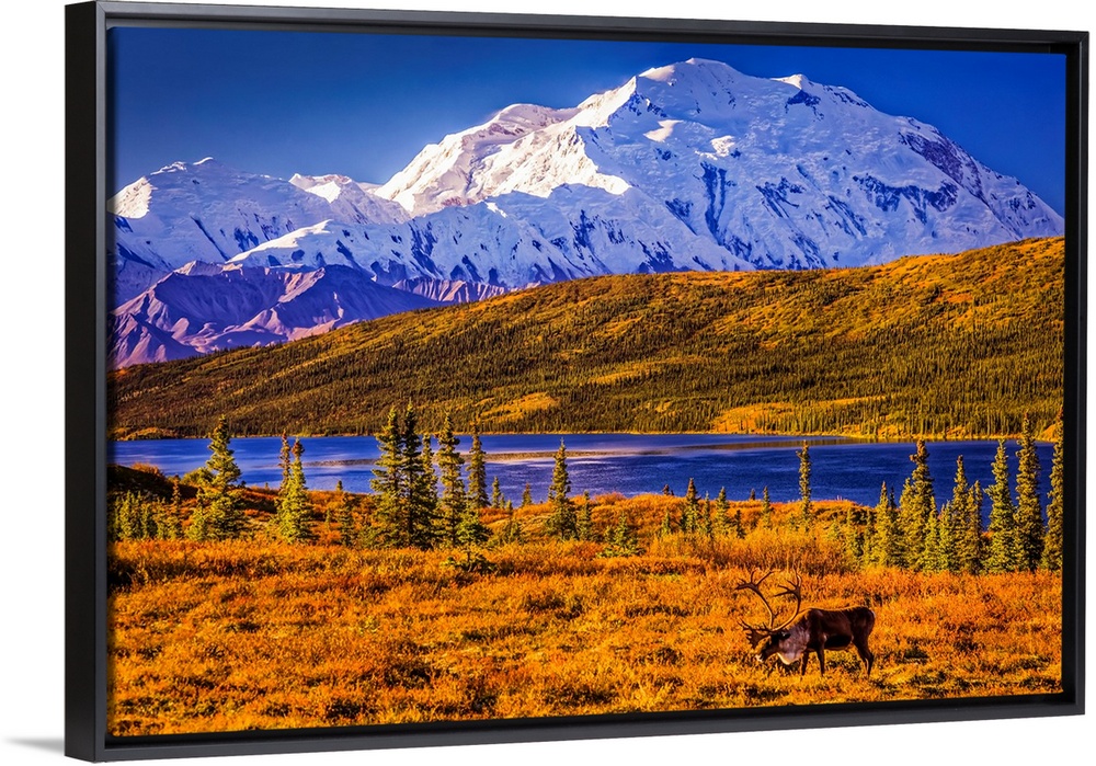 <p>Bull Caribou (Rangifer tarandus) feeding on autumn coloured tundra with Mount Denali (McKinley) and Wonder Lake in the background, Denali National Park and Preserve, Interior Alaska, Alaska, United States of America</p>