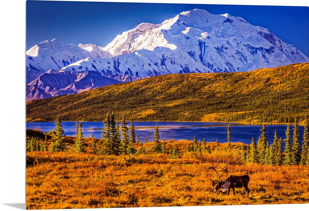 <p>Bull Caribou (Rangifer tarandus) feeding on autumn coloured tundra with Mount Denali (McKinley) and Wonder Lake in the background, Denali National Park and Preserve, Interior Alaska, Alaska, United States of America</p>