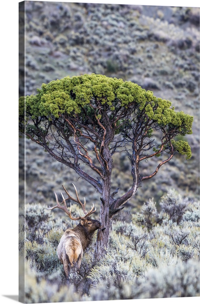<p>View taken from behind of a bull elk (Cervus canadensis) standing in a field of sagebrush (Artemisia tridentata) next to a juniper tree (Juniper scopulorum), Yellowstone National Park, United States of America</p>