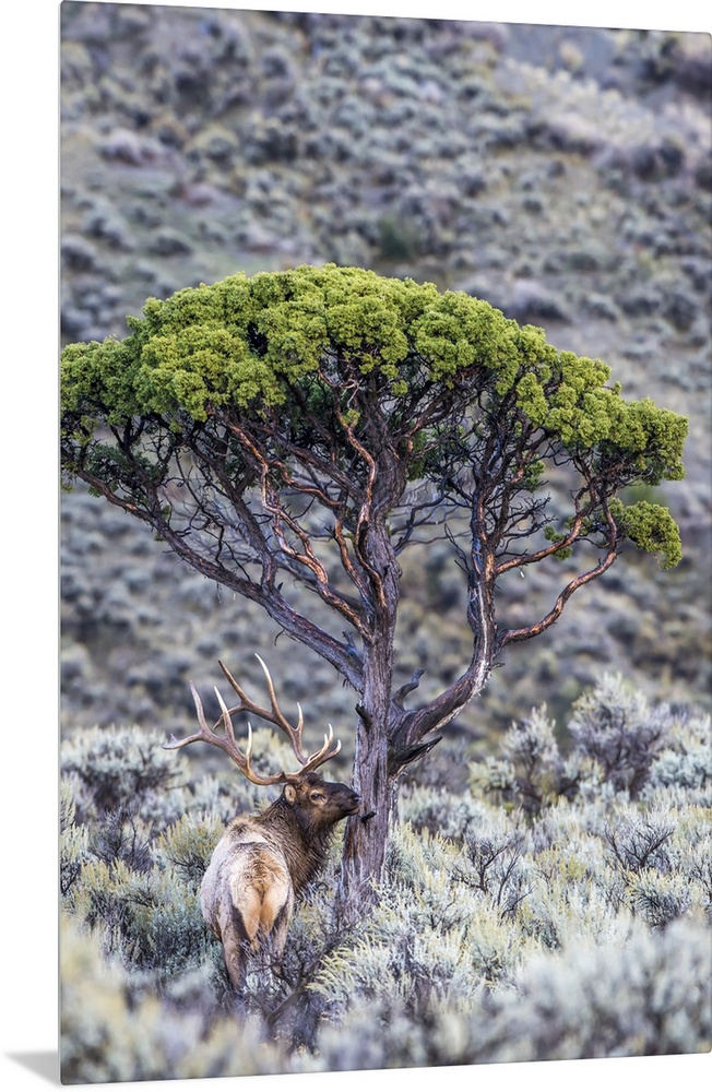 <p>View taken from behind of a bull elk (Cervus canadensis) standing in a field of sagebrush (Artemisia tridentata) next to a juniper tree (Juniper scopulorum), Yellowstone National Park, United States of America</p>