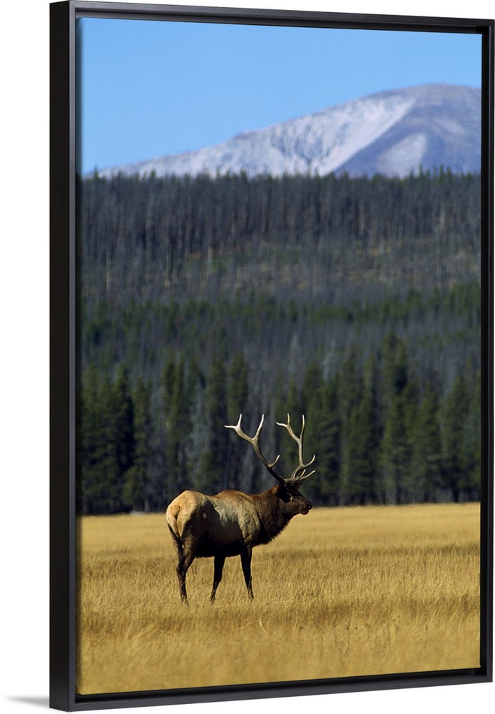 <p>Vertical photograph on a big canvas of an elk with large antlers, standing in a grassy, golden field. A dense hillside of pine trees in the background rise toward a snow covered mountain.</p>