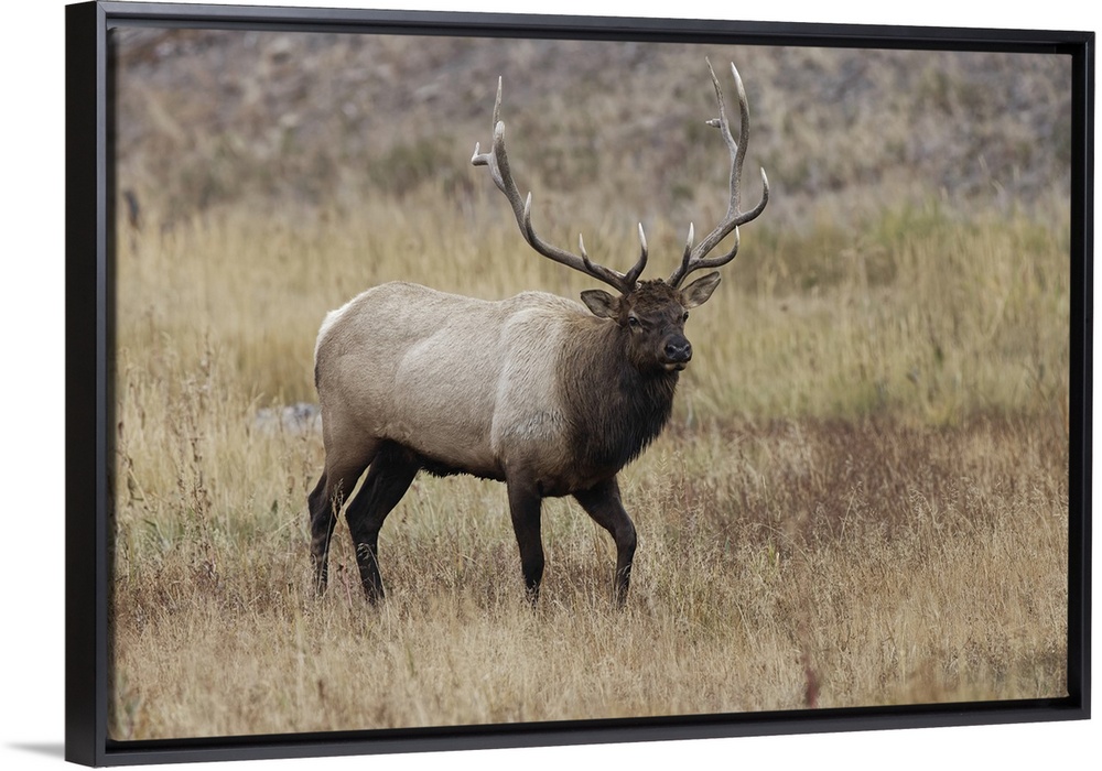 <p>Bull elk or wapiti in meadow, Yellowstone National Park, Wyoming. United States, Wyoming.</p>