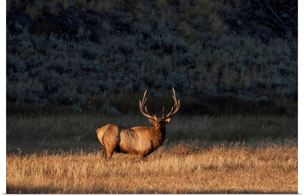<p>Bull elk (Cervus canadensis) stands in a prairie and looks at the camera in Yellowstone National Park, Wyoming, United States of America</p>